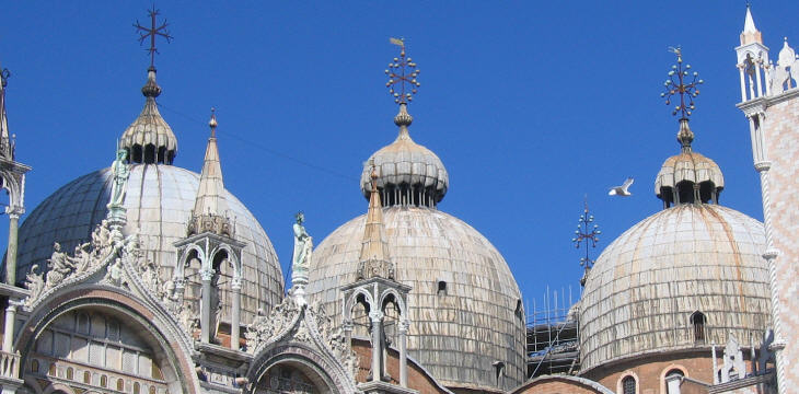 When the Venetians decided to build S. Marco they had in mind the two most celebrated churches of Constantinople: Hagia Sophia, at the time the largest church of the world; it was built by Emperor Justinian in 537 - a tall building with an impressive dome; or the Apostoleion, a Greek cross church (lost) with five domes where Emperor Constantine was buried. The Apostoleion was chosen which did not cause major static worries because of its weight.
