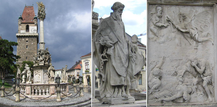(left) Pestsaule, a column celebrating the end of a pestilence; (centre) St. Leonard of Noblac, patron of the prisoners of war; (right) relief depicting an angel sheathing his sword, a sign that the pestilence was ending