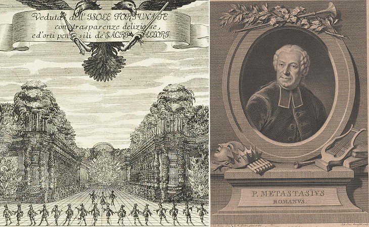 (left) Scenery for "Angelica vincitrice su Alcina" (two personages of "Orlando Furioso", a poem by Ludovico Ariosto), an outdoor performance of an opera by Johann Joseph Fux (music) and Pietro Pariato (libretto) which was staged in September 1716 by Ferdinando Galli di Bibbiena for Emperor Charles VI in celebration of the birth of his son Leopold; (right) portait of Pietro Metastasio in a late XVIIIth century engraving