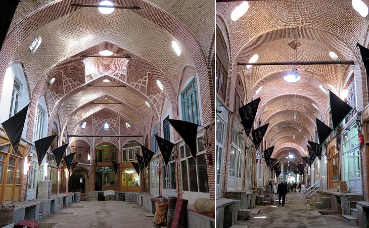 Tabriz Bazaar: (left) Mozzaffarieh, an alley which is devoted to handwoven rug; (right) another alley