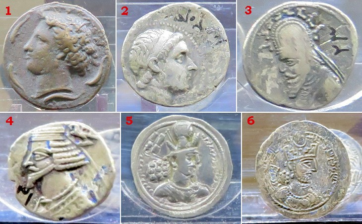 Azerbaijan Museum of Tabriz: coins: 1) Gelon, tyrant of Syracuse in 485-478 BC; 2) Seleucus I, general of Alexander the Great and founder of an empire named after him; 3) Phraates III, Parthian Emperor in 70-57 BC, who fought against Pompey; 4) Phraates IV, Parthian Emperor in 37-2 BC, who fought aganst Antony; 5) Sapur II, Sassanid Emperor in 309-379 AD, who fought against Constantine's heirs; 6) Bahram V, Sassanid Emperor in 420-438, who fought against Theodosius II