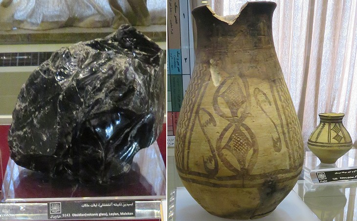 Azerbaijan Museum of Tabriz: (left) obsidian, volcanic glass; it was fractured into pieces with sharp edges which were used as tools/weapons before the development of metallurgy and thus it had a great value (see also the pages on ancient Sicily and Lebanon); (right) IVth millennium BC pottery