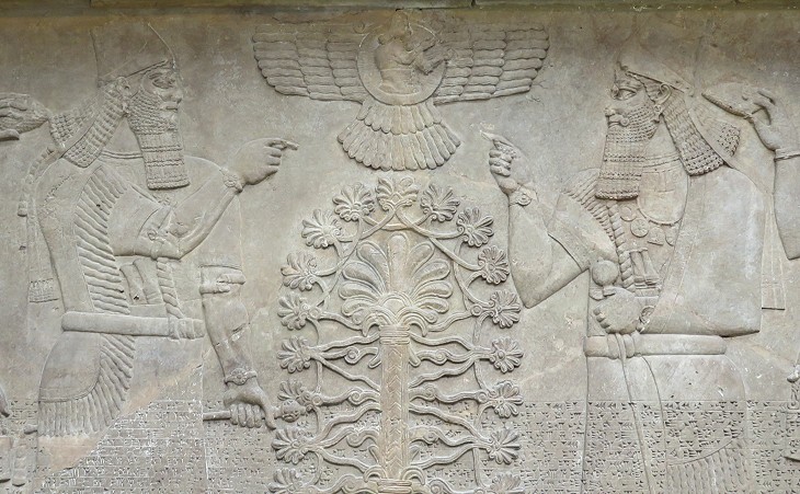 British Museum: gypsum wall panel from the Assyrian royal palace at Nimrud, in Northern Irak (IXth century BC): King Ashurnasirpal II appears twice, dressed in ritual robes and holding the mace symbolising authority. In front of him there is a Sacred Tree and he makes a gesture of worship to a god in a winged disc. This god today is a symbol of the Zoroastrian religion and it can be seen also in reliefs near Persepolis; the Zoroastrians regard the cypress as a sacred tree