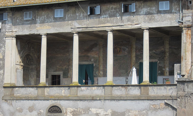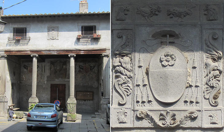 The building shown above was for some time the Town Hall of Bagnaia; it is decorated with an elaborate coat of arms of Cardinal Riario, very similar to those which embellish Palazzo della Cancelleria; this coat of arms is surrounded by cocks (It. galli) a reference to Jacopo Galli, an advisor to the cardinal. Paintings on the walls of the loggia show other coats of arms, including that of Cardinal Antonio Barberini the Younger, nephew of Pope Urban VIII, but they are in poor condition.
