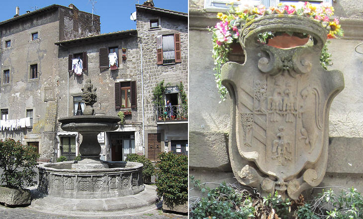 (left) Main square of old Bagnaia with a fountain built by Cardinal Montalto; (right) coat of arms of the Lante Della Rovere