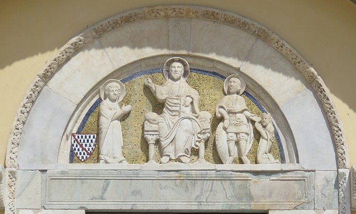 The relief originally stood on the entrance to the enclosure. For a long time it was thought that Arechis was shown in the right corner while being introduced to Jesus Christ by St. Mercury, a IIIrd century Christian soldier and martyr, whose body was buried in the church by Arechis. Today the relief is dated XIIIth century and the kneeling person is identified with an abbot of the Benedictine monastery adjoining the church.