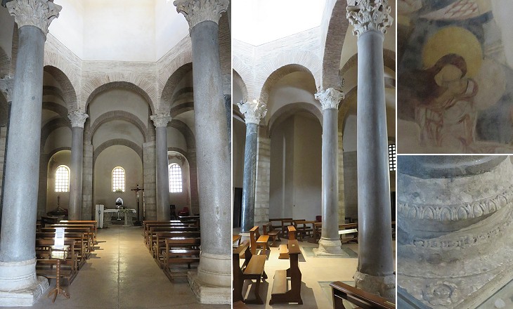 (left/centre) Interior; (right-above) fragment of a fresco in one of the side apses; (right-below) base of one of the columns