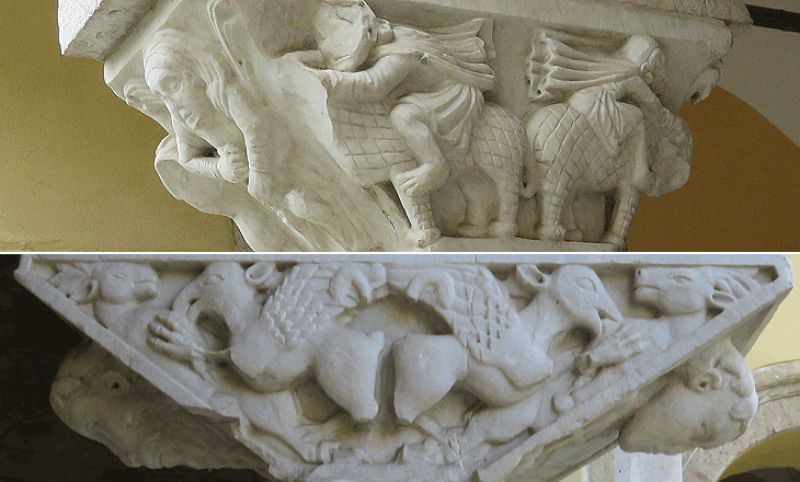 Pulvini of the shape of those in S. Sofia are very unusual: their long sizes were decorated with scenes whereas the short ones in some instances housed a head, as that shown in the image used as background for this page, or a saint. Art historians have identified style similarities among three groups of pulvini which have therefore been attributed to a Master of the Elephants, a Master of the Dragons and a Master of the Months. Most likely they were Benedictine monks.