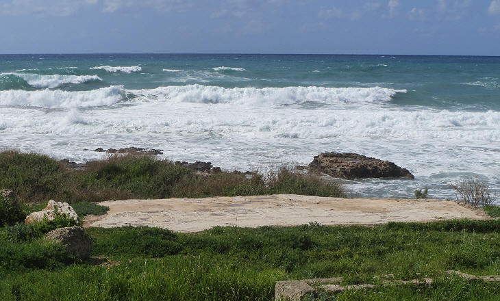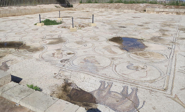 Floor of a synagogue and behind it sections of ancient walls which have collapsed into the sea