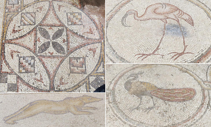 Birds inside medallions are portrayed in the central part of the mosaic, whereas wild animals (including the lion which you see in the image used as background for this page) are depicted in the frame. Birds and wild animals were a common subject for mosaics and they were often associated with Orpheus (e.g. at Philippopolis in Syria); when the portrayal of pagan gods and heroes was forbidden, the animals were depicted by themselves e.g. at the Villa of the Aviary at Carthage.