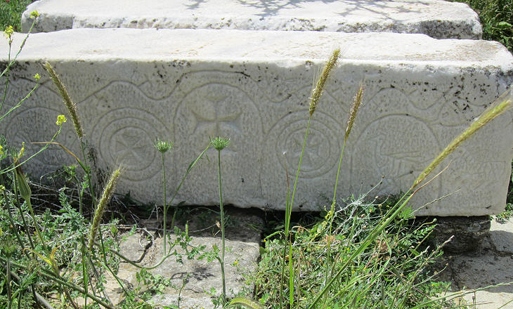 This side of the hill hath ascents one above another, distinguished by Walls on each side of the place, supposed to have been the way up: Which have been wonderfully Beautified with Porticoes, or Cloysters, and other Buildings; as the abundance of Pillars, Pedestals, Architraves, and other Fragments of excellent Marble, ranging streight and Parallel to each other, do sufficiently testifie: (..) Among these ruins we found an Altar dedicated to Serapis, Isis, Anubis, Harpocrates and the Dioscouri; who perhaps had a Temple there. Wheler