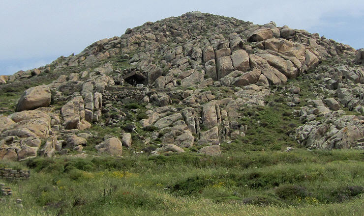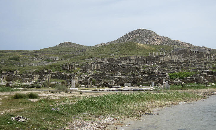 Mt. Cynthus lies behind the Theatre's Quarter and today it is a barren rock; according to the Greek myth however Leto bore Apollo on this site between an olive-tree and a date-palm.