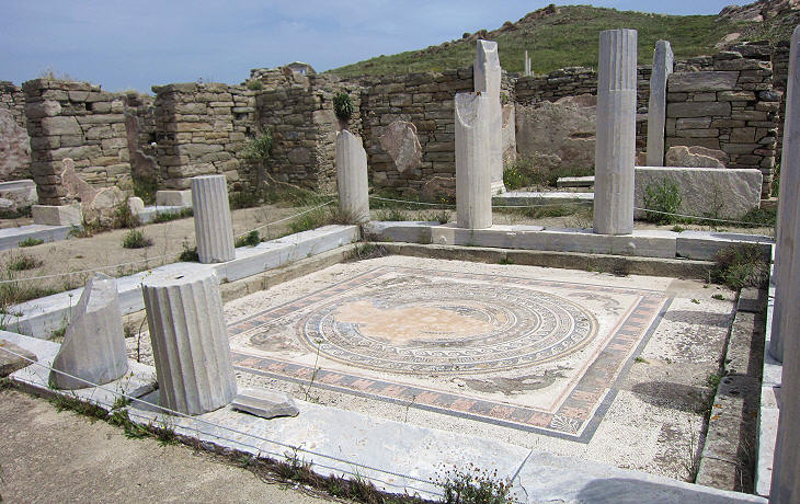 The mosaic which embellished this house has a circular format, unusual for Delo; in the corners between the square frame and the central section showing a complex rosette are pairs of dolphins ridden by tiny winged figures carrying emblems of various gods: the mosaic is signed by Asklepiades, a Phoenician from Arados (Arwad). In many mosaics having a circular central section the corners were filled with depictions of the Four Seasons, e.g. in Tunisia.