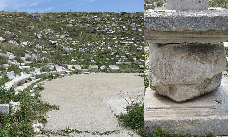 (left) Theatre seen from the stage with some seats which were reserved to priests/magistrates; (right) a relief showing a laurel wreath
