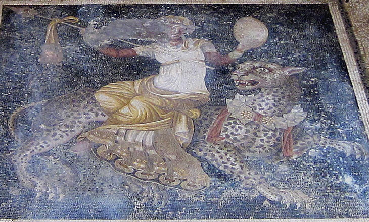 The mosaic depicts the god with outstretched wings and ivy wreath, mounted on a panther (a term used by the Greeks to generically refer to a big cat, see a mosaic in Tunisia showing Dionysus on a chariot drawn by four panthers) with a wreath of vine branches and