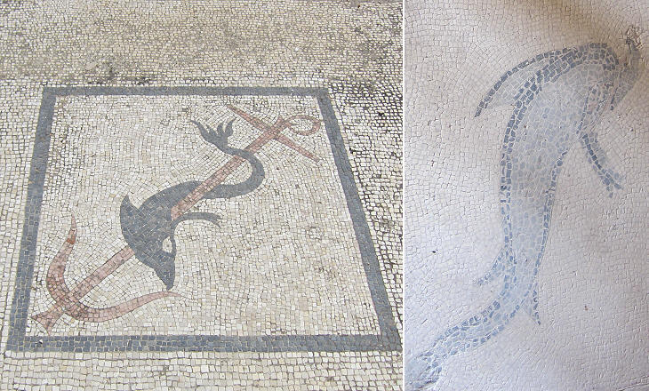 Mosaics portraying dolphins: (left) House of the Trident; (right) House of the Masks