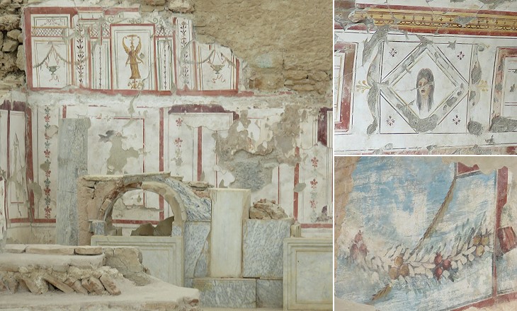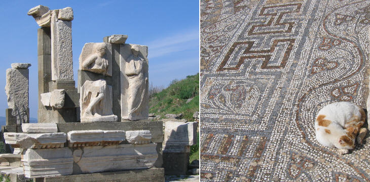 (left) Monument to Silla by Gaius Memmius where the Street of the Kouretes joins the Procession Street. The reliefs portray members of Silla's family (in 2006); (right) Vth century mosaics along the Street of the Kouretes