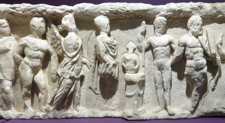 Archaeological Museum of Ephesus: detail of a frieze from the Temple to Hadrian (IVth century AD). It shows a Roman Emperor making a sacrifice in front of an altar decorated with garlands. The Emperor wears a military tunic and is crowned by a Nike, a winged Victory. On the right of the altar is a male figure, possibly Theseus, and next to him Heracles (you may wish to see another detail of the frieze portraying Emperor Theodosius and his family among the Olympian Gods)