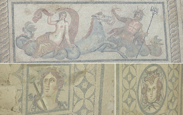 Terrace Houses: mosaics portraying a marine subject (above), Dionysus (below-left) and Medusa (below-right)