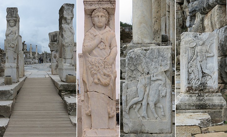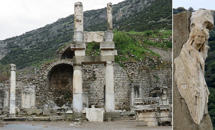 The Library of Celsus was built during the reign of Emperor Hadrian and a temple was erected in Ephesus to celebrate the Emperor: the design of its entrance reminds the viewer of the Canopus of Villa Adriana, near Tivoli. Some columns of the temple are made of cipollino, a marble the Emperor liked very much and which was used throughout the empire in many monuments of the IInd century AD, e.g. Hadrian's Library in Athens.