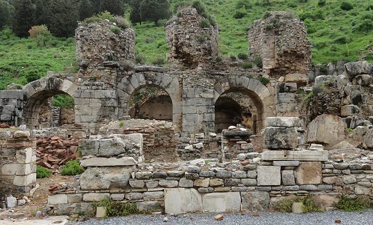 A city of some 250,000 inhabitants does not vanish in a day. In 262 a major earthquake struck Ephesus, soon after the Goths raided the city, the Artemision was destroyed in the early IVth century, then the harbour silted, etc. All these events had an impact on the monuments of the city and archaeologists had to make a choice on which historical period was to be preserved. By and large their decision has been to bring back the city to the days Emperor Hadrian visited it. Archaeologists found evidence of six luxury Roman houses of that period beneath layers of later Byzantine buildings. They removed the latter and in April 2015 they were in the process of reconstructing the houses.