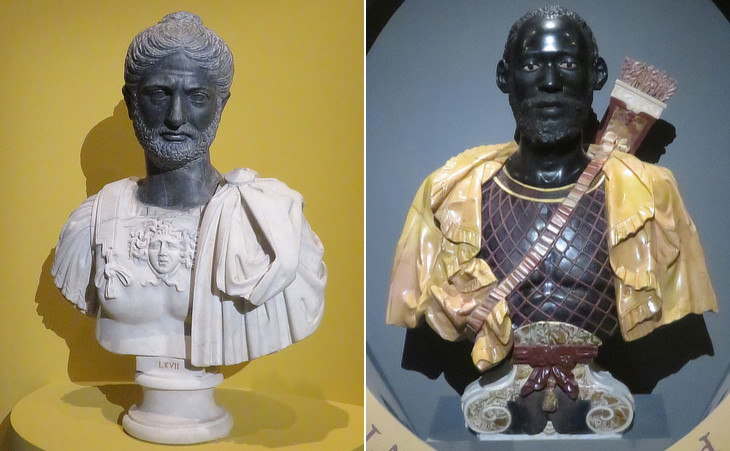The depiction of people from faraway lands can be noticed already in ancient reliefs where they contributed to the celebration of the glory of an emperor, e.g. the Apadana of Persepolis or Colonna Traiana in Rome. The black marble head is generally thought to be a work of the IInd century AD whereas the bust supporting him was most likely made by a member of the Della Porta family of sculptors in the late XVIth century. Art historians are still divided about the personage it portrays, because it does not fit with the traditional iconography of a barbarian because of his hairstyle; it has been suggested it might be an Indian ambassador because Cassius Dio reports that: Upon Trajan's return to Rome ever so many embassies came to him from various barbarians, including the Indi. (Roman History - LXVIII; 15)