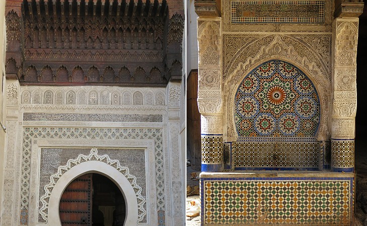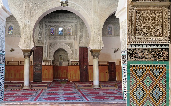 Medrese Bou Inania: (left) Prayer Hall; (right) detail of its tile decoration