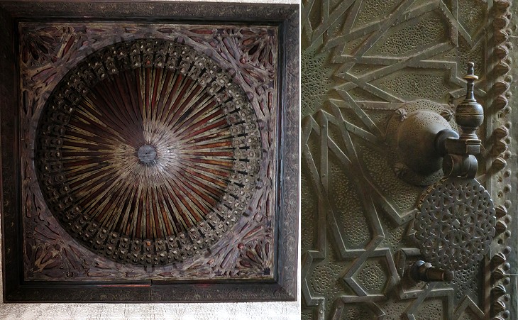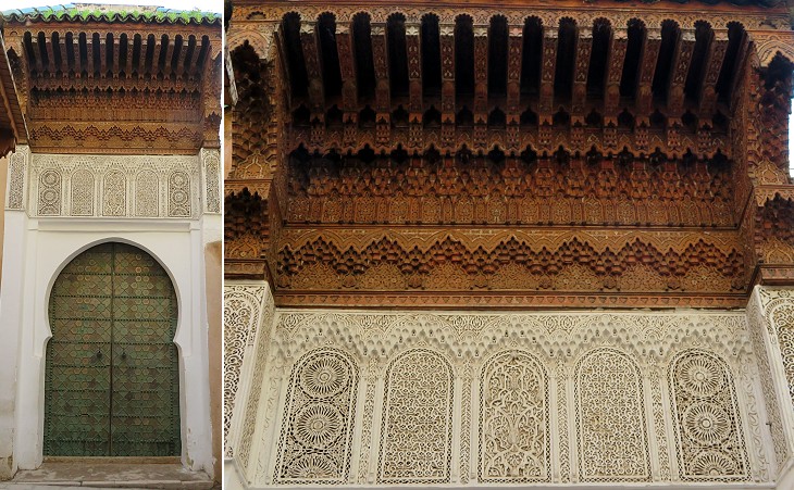 Medrese Bou Inania: (left) ceiling in the prayer hall; (right) detail of a bronze door; see another detail of this medrese in the introductory page and another medrese built by Abou Inan at Meknes and one built by his father at Salé