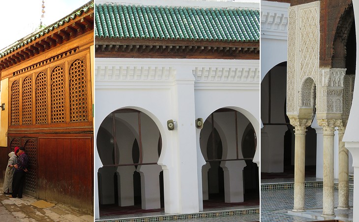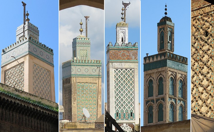 Minarets: (left) Medrese Bou Inania; (centre) two other minarets; (right) "sebka" decoration of a minaret