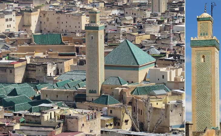 (left) The Great Mosque seen from the Marinid Tombs; (right) its minaret seen from Fondouk el-Nejjarin