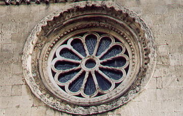 | rose window a rose window is a large circular window above the entrance of a church. It is usually decorated and split into sections. The image shows the rose window of S. Giovanni Battista dei Gerosolimitani in Corneto (Tarquinia). | ![]() |