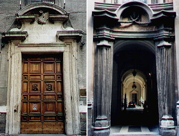 | Vitruvian opening Vitruvius was a Roman architect who dedicated to Emperor Augustus a treatise (De Architectura) which soon became the most comprehensive summary of classical architecture. The treatise was rediscovered in 1414 and it had a great influence on Renaissance architects from Leon Battista Alberti to Andrea Palladio. In this text Vitruvius described an entrance to a building tapered towards its top. It was typical of Ancient Egypt and it became very much in fashion in the funerary monuments of the Neoclassic period. The images show the side entrances of Collegio Romano and of Palazzo di Propaganda Fide in Rome. Another example of Vitruvian opening can be seen in Carceri Nuove. | ![]() |