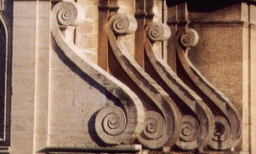 | volute volute is a decorative theme consisting in a spiral and it is typical of the Ionic order. It was used by many Renaissance architects to link the lateral and lower portions of a façade to its central higher part. The image shows a detail of S. Maria ai Monti in Rome. | ![]() |