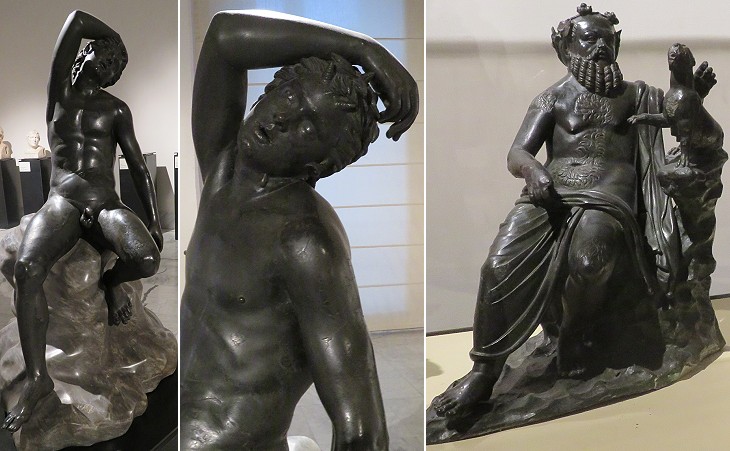 Archaeological Museum of Naples: (left/centre) Sleeping Satyr from one end of the pool of Villa dei Papiri; (right) small bronze statue of Silenus with a panther, a symbol of Dionysus