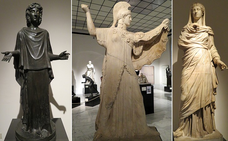 Archaeological Museum of Naples: (left) Hypermnestra; (centre) Athena Promachos (who fights in the front line), a (lost) gigantic bronze statue of her stood in the Acropolis of Athens; (right) Pudicitia