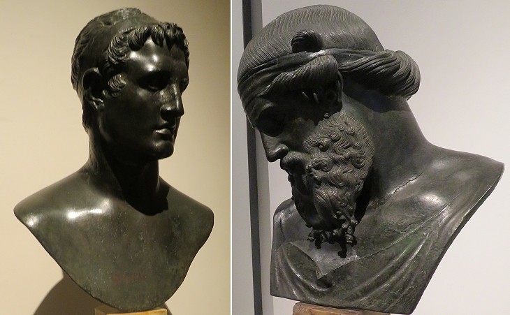 Archaeological Museum of Naples: bronze busts from Villa dei Papiri: (left) a king of the Seleucid dynasty; (right) a king wearing an elaborate copper headdress