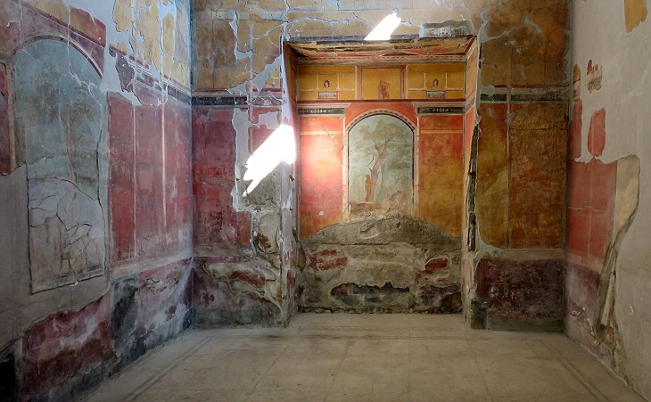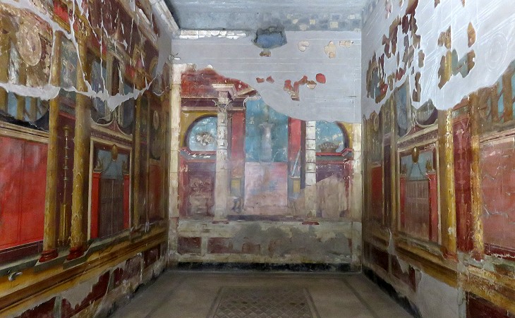 The Great Rear Hall was flanked by two porticoes which were decorated in the fourth style with large red and yellow panels. Because of the lack of remains of food and of other signs of occupancy, archaeologists believe the villa was not populated at the time of the eruption.