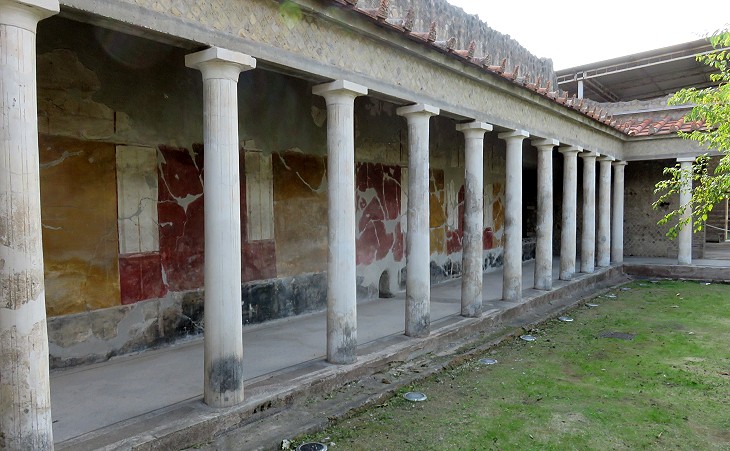 Archaeologists have unearthed three sides of this peristyle. The fourth one either lies beneath the houses of Torre Annunziata or it might have never existed. In this case the courtyard/garden would have had a balustrade facing the sea, which today is some 300 meters away. The porticoes were supported by fluted stucco columns with a brick structure.