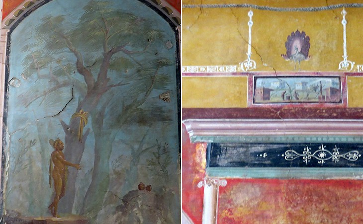 "Calidarium": details of its wall paintings: (left) Hercules in the Garden of the Hesperides, a very popular subject throughout the whole Roman Empire; (right) other details (another one can be seen in the image used as background for this page)