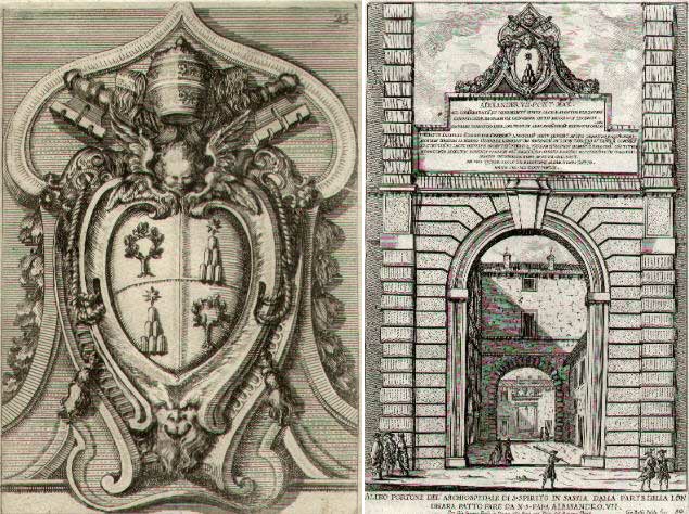 (at S. Spirito in Sassia)Spedale di S. Spirito in Sassia was founded at the beginning of the XIIIth century by Pope Innocent III and it was rebuilt towards the end of the XVth century by Pope Sixtus IV. Pope Alexander VII in 1664 asked Gian Lorenzo Bernini to design new entrances to the hospital: the entrance in Borgo S. Spirito still exists and retains the coat of arms, while the coat of arms on the entrance in Via dei Penitenzieri is lost. Giovanni Battista Falda was the most famous engraver of Roman views of the XVIIth century and he left a view of this entrance. The coat of arms of Alexander VII shown in the view by Falda is different from that shown in his book by Filippo Juvarra, but the details of the design coincide. In the background of this page you can see a current picture of the hospital which in the 1940s was given a XVth century look.