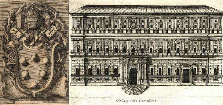 The background of this page shows a detail of Palazzo della Cancelleria depicting the heraldic symbols of Pope Sixtus V.