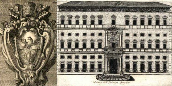 - Paul V by Martino Lunghi (at Palazzo Borghese)Today Palazzo Borghese is somewhat neglected in favour of Villa Borghese which houses paintings and statues many of which are masterpieces. It's a pity because this palace has very interesting features e.g. the winter garden on the River Tiber and a fine courtyard (in the background of this page). The coat of arms of Pope Paul V is no longer there so we are left with the plate by Filippo Juvarra, while an XVIIIth century engraving shows where it was.
