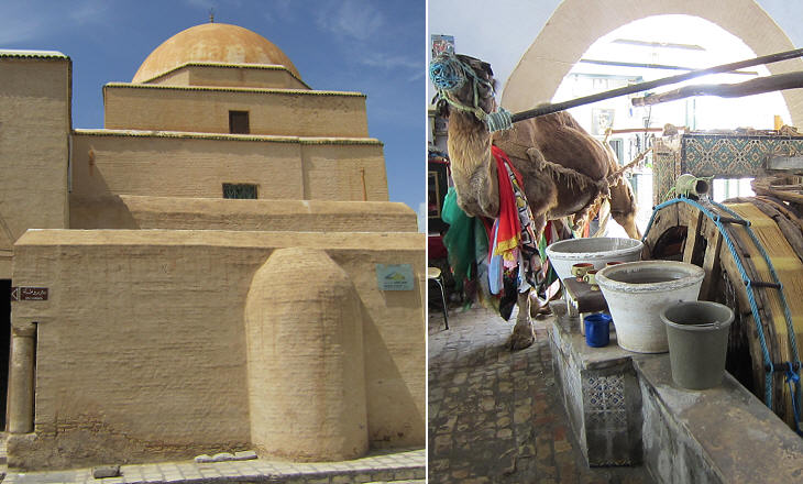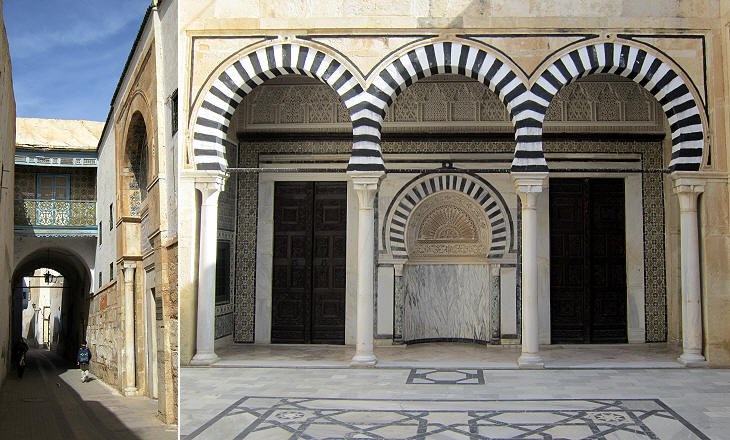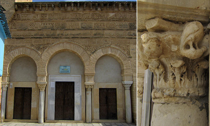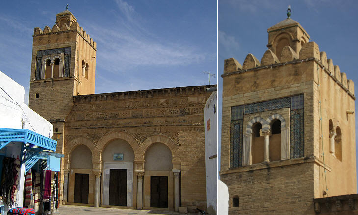 The oldest mosque of Kairouan (except for the Great Mosque) is located in a small square in the centre of the old town. It was built in the IXth century and it was modified in the XVth century by the addition of a minaret which shows the influence of Spanish Moorish architecture. Its design is unusual because the prayer hall is not preceded by a portico or a courtyard, but it is directly accessed from the street. It is a single chamber supported by sixteen ancient columns, similar to those which decorate the façade.
