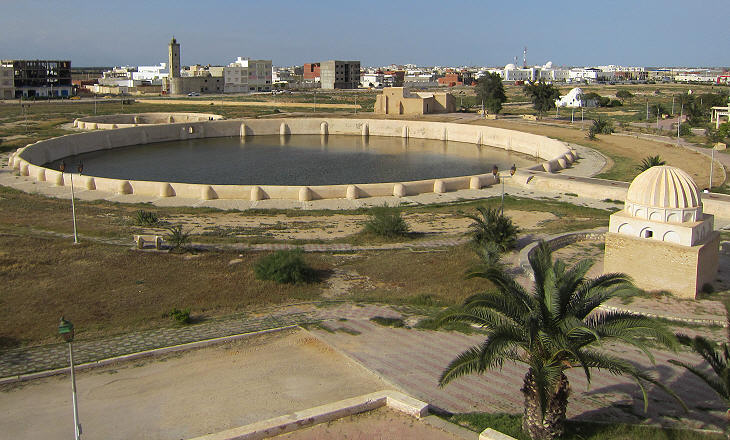 The location chosen for founding Kairouan in the VIIth century was dictated by military needs, but when the town developed and became the capital of the region, its being situated in a very arid area required the construction of reservoirs where water coming from a remote spring was stored. The water was cleared from debris and other impurities by being moved from one reservoir to the other. The basins were built in the IXth century a mile north of the walls and were reactivated by the French in the late XIXth century.