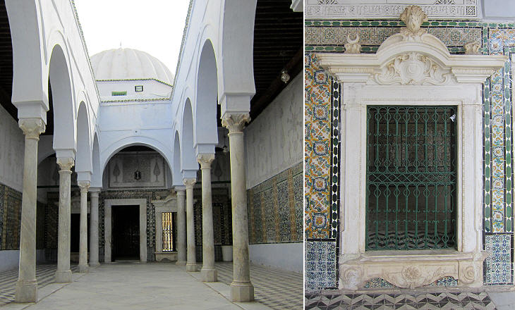 Zaouia Sidi Abid el-Ghariani: (left) portico of the first courtyard; (centre) tiles depicting Sultan Ahmet Cami (the Blue Mosque) and its six minarets at Constantinople; (right) an ancient column with an Andalusian-style capital