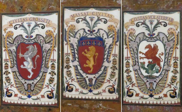 Florence - Cappella dei Principi - coats of arms of: (left) Grosseto; (centre) Massa Marittima; (right) Volterra