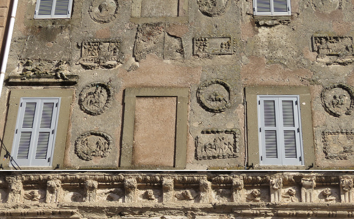 Palazzo Castagna (Chestnut) near the central fountain: (above) part of the run-down façade after years of neglect; (below) cornice with the symbol of the family, a sweet chestnut cupule, at the top of the building