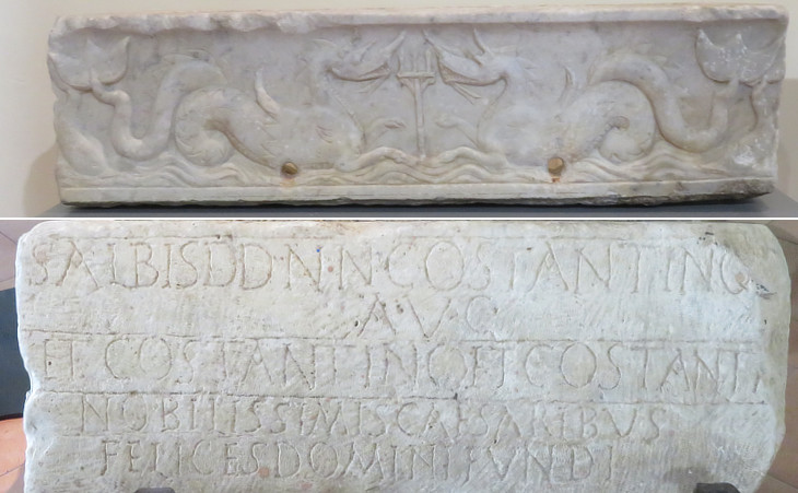 Town Museum: (above) Roman sarcophagus of an infant with a decoration based on sea-monsters; (below) inscription wishing well to Emperor Constantine