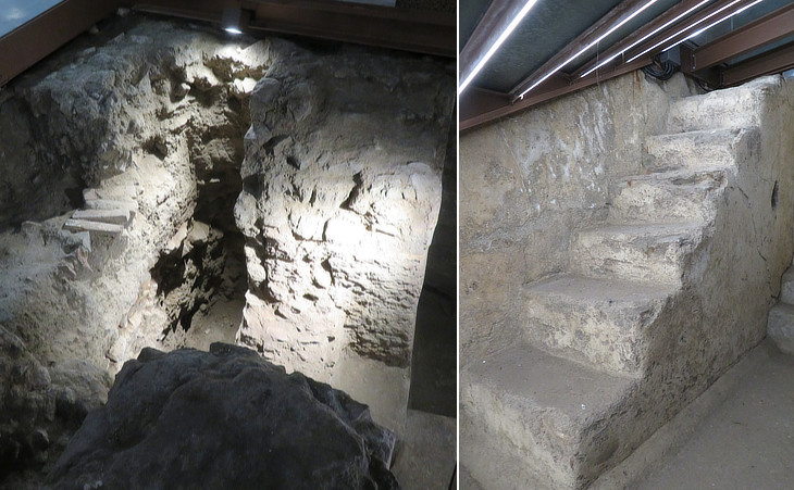 (left) Roman wall which was broken and led to the discovery of the "mithraeum"; (right) the seven steps leading to the small shrine, a reference to the seven grades of initiation of Mithra's cult