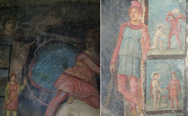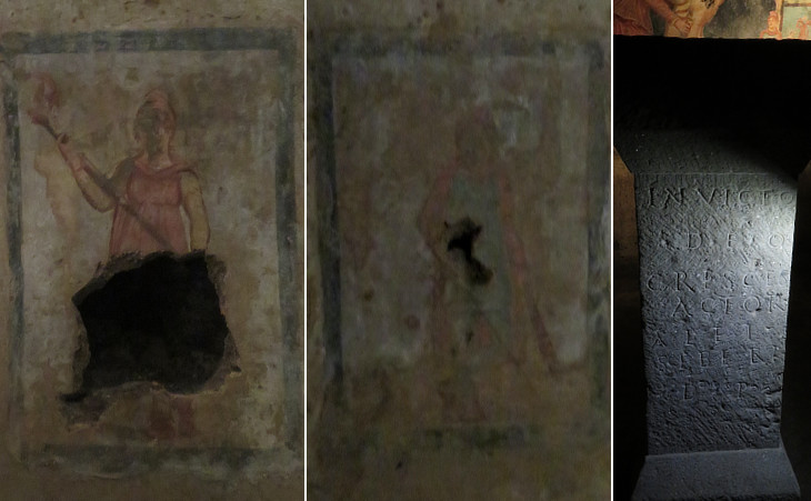 (left/centre) Frescoes portraying the two torch-bearers Cautes and Cautopates; (right) stone altar with the inscription INVICTO DEO CRESCES ACTOR ALFI SEBERI D(onum) P(osuit) - To the Invincible God, Cresces, administrator of Alfius Severus, placed as a donation